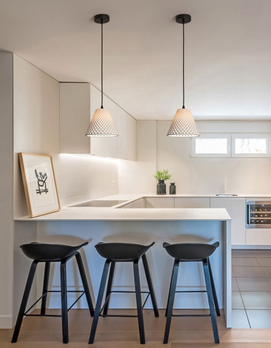We love how this modern minimalist looking pendant light adds simple touch to your dining and living spaces. Made of resin, the lamp shade comes perforated, allowing light to exude subtly.
